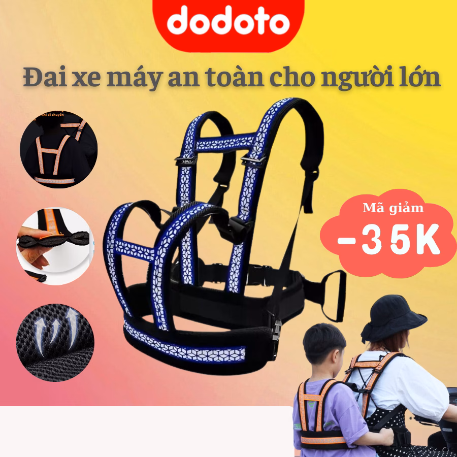 Đai xe máy an toàn cho bé dodoto có tính năng phản quang, giúp tăng khả năng hiển thị khi đi xe máy trong điều kiện ánh sáng yếu. Sản phẩm này cũng có cách sử dụng đơn giản và tiện lợi, chỉ cần đặt bé vào đai và điều chỉnh kích thước phù hợp.