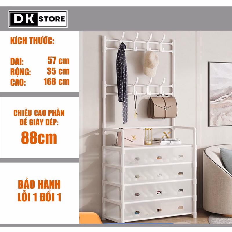 Kệ giày dép 5 tầng không chỉ đơn thuần là nơi lưu trữ giày dép mà còn được tích hợp nhiều tính năng tiện ích. Một trong những tính năng nổi bật là khả năng kết hợp với móc treo đồ. Bạn có thể sử dụng móc treo để treo áo khoác, mũ, balo, hoặc các phụ kiện khác, giúp tối ưu hóa không gian lưu trữ.