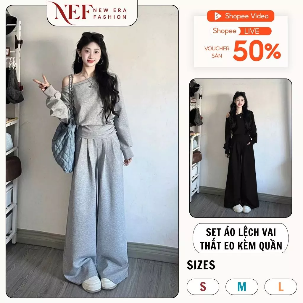 🔥 [VOUCHER 30K] Set Quần Áo Nỉ Dài Tay Trễ Vai – Áo trễ Vai Và Quần Ống Rộng New Era Fashion đang giảm giá!
